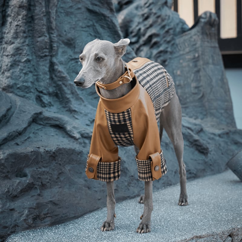 ASHWOODジャケットで、愛犬のファッションを一新しましょう。ブラウンのチェック柄ウールツイードに、エレガントなヴィーガンレザーのスリーブを組み合わせたこの一着は、まさにペットファッションの傑作です。