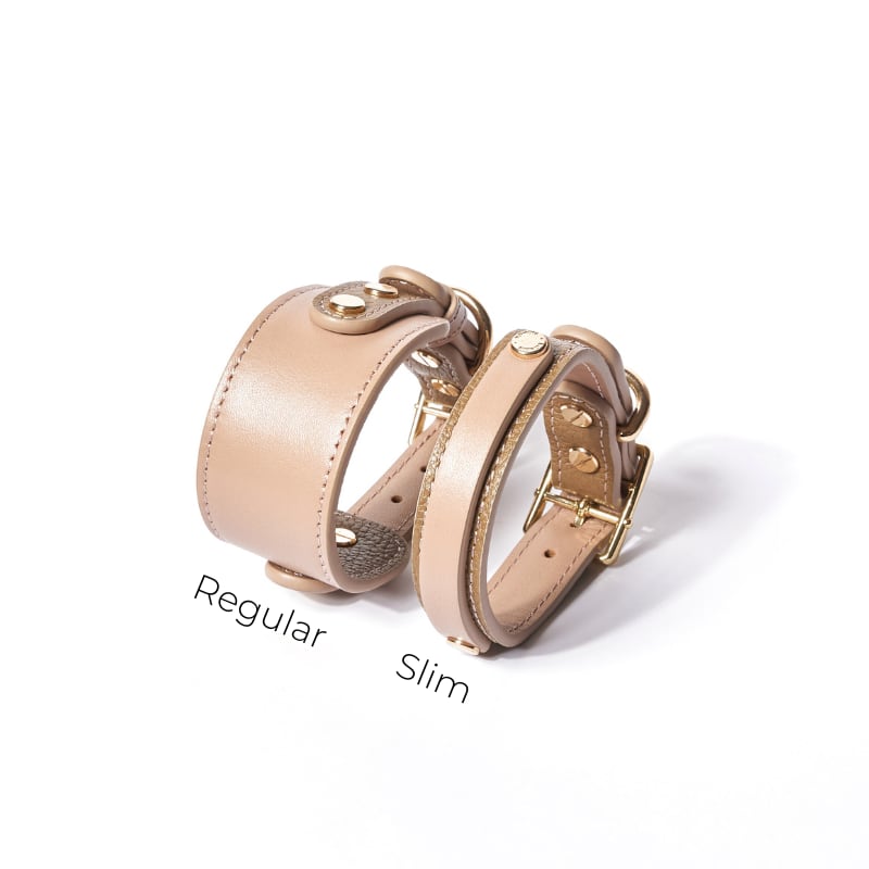 おとぎ話のような美しさを愛犬に——「スリム BLUSHWOOD レザードッグカラー」をご紹介します。快適さとフィット感を追求し、上質なカーフスキンレザーを使用。温かみのあるトープグレインとやわらかなアッシュピンクの美しいバイカラーが特徴です。高級感あふれるゴールドハードウェアをあしらい、まるでプリンセスのような気品を放ちます。