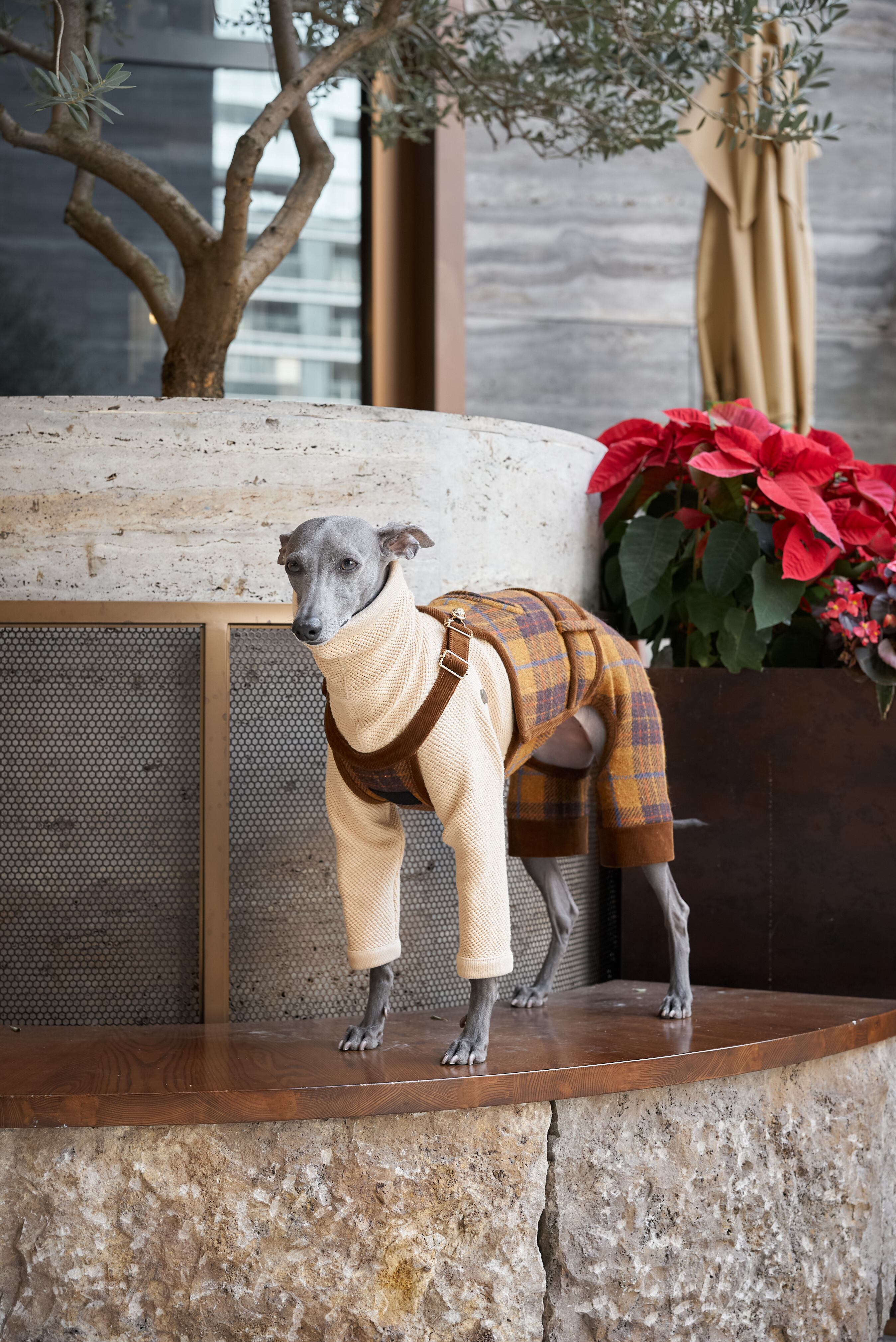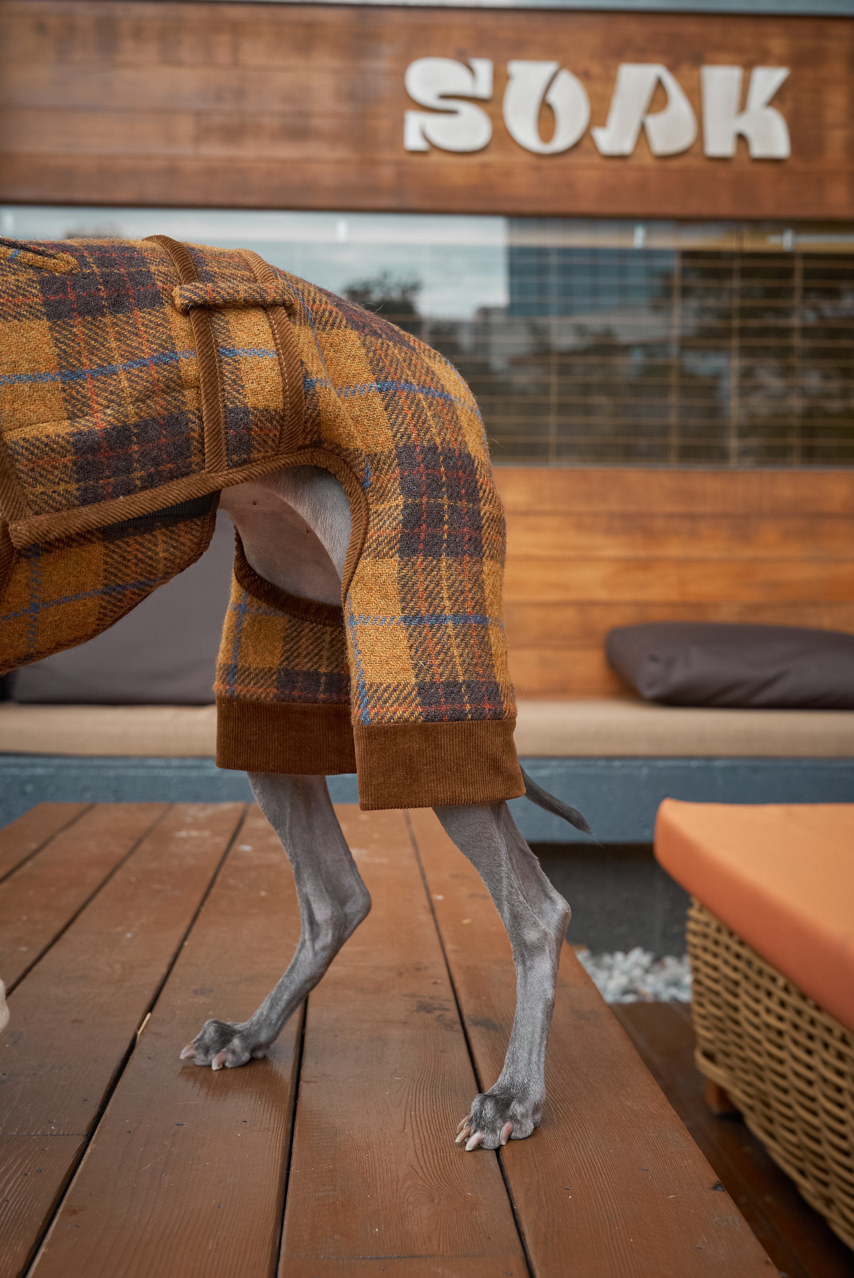 100%のイエロータータンウールツイードとシックなブラウンのコーデュロイディテールで仕立てられたこのオーバーオールは、快適さと耐久性を兼ね備えています。調整可能な脚の長さにより、愛犬にぴったりとフィットし、どんなサイズの犬にも快適さを提供します。
