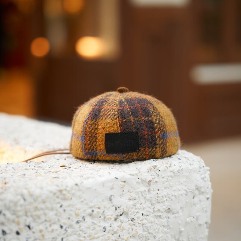 HERITAGE HIGHLAND ドッグニュースボーイキャップを紹介します。スタイリッシュな愛犬にぴったりの究極のアクセサリーです!高級ウールツイードタータン生地で作られたこのドッグキャップは、黄色のチェック柄とエレガントなブラウンのコーデュロイディテールが特徴で、英国の気品あふれるスタイルを加えています。町中を歩く時や特別なイベントに最適なこのキャップは、ファッション性と快適さを兼ね備えています。