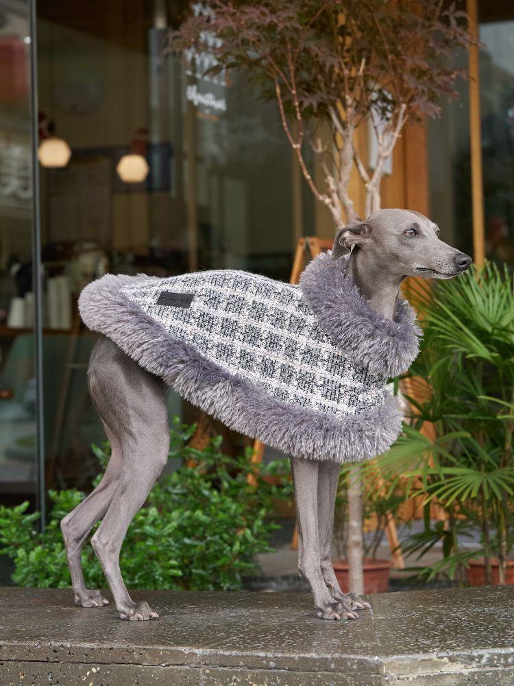 チェック柄のツイードにファー襟&ファートリムをあしらった一着。冬のパリの賑やかな街並みにぴったりです。また、シックなグレーの色合いは「グレーが新しいブラック」と思わせるほど洗練されており、愛犬を生まれながらのトレンドセッターに仕立てます。
