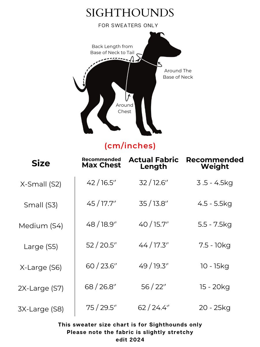サイトハウンド専用のサイズ表です。生地はやや伸縮性があります。
