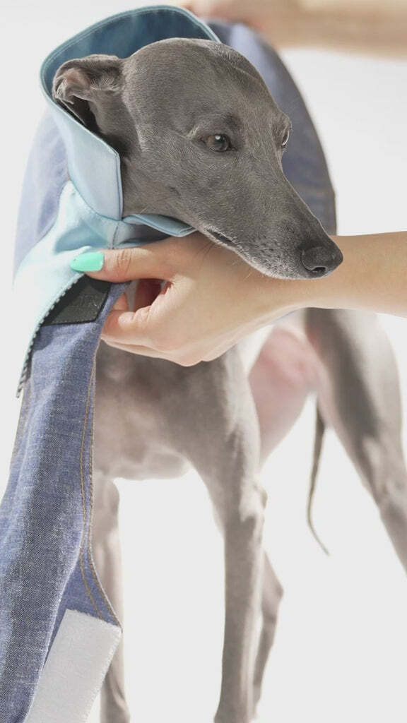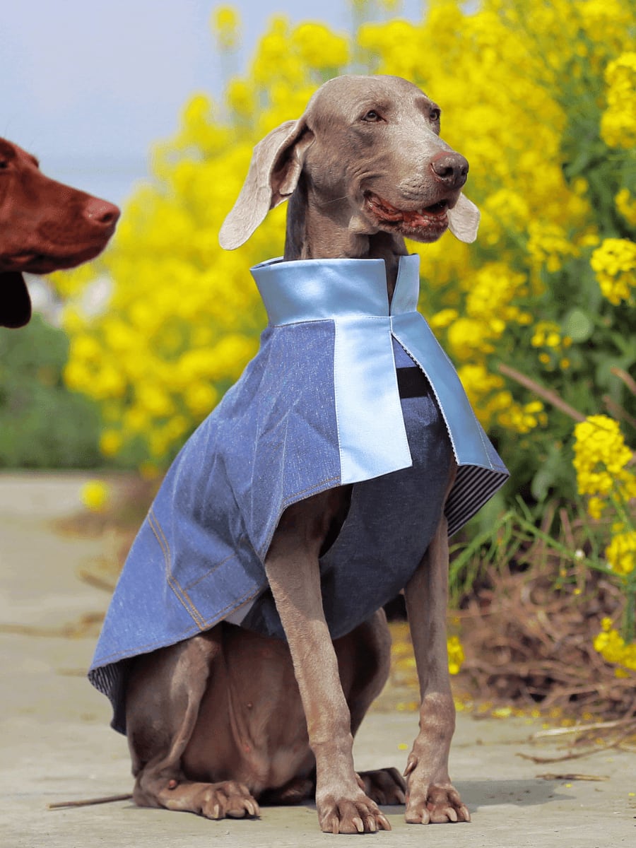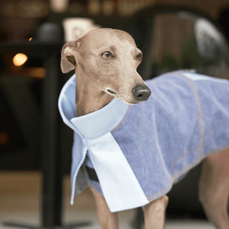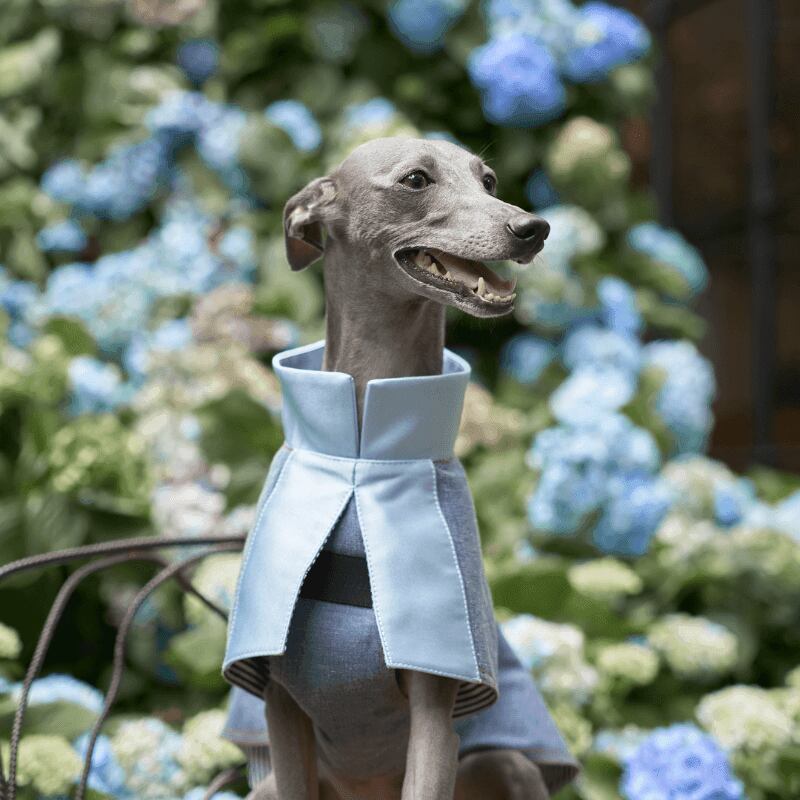 上質なリネンデニムを贅沢に使用し、通気性と軽やかな着心地を実現。爽やかなパウダーブルーのシルキーカラーが、愛犬の装いにエレガントなアクセントを添えます。