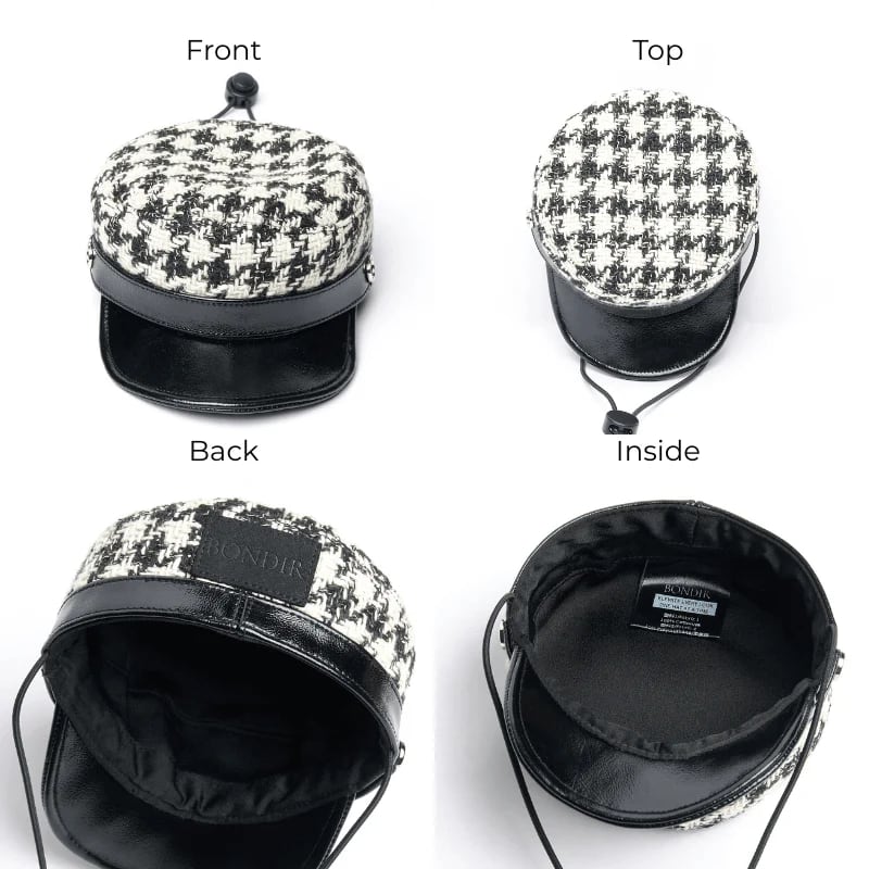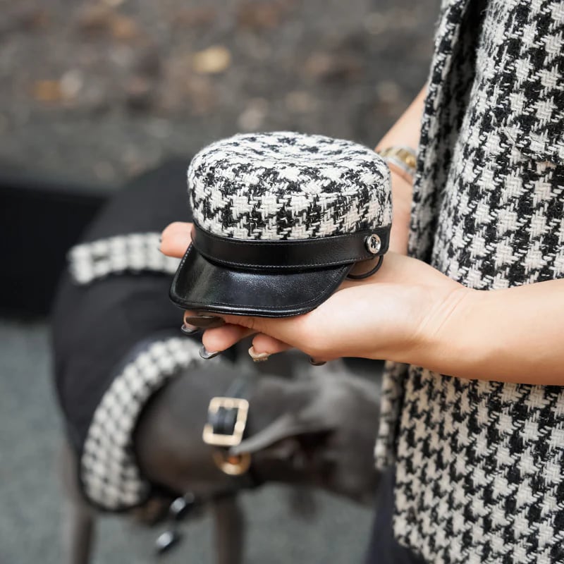 ビーガンレザーのアクセントとスリークなブラックハウンドトゥース生地で作られたSOHO ハットは、愛犬のワードローブを完成させる究極のアクセサリーです。