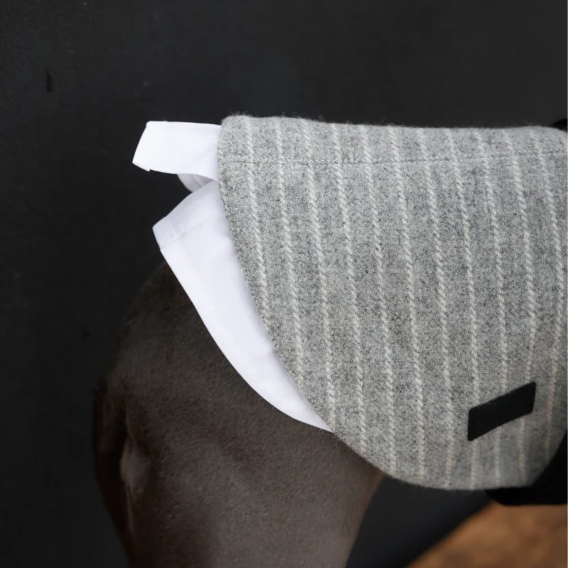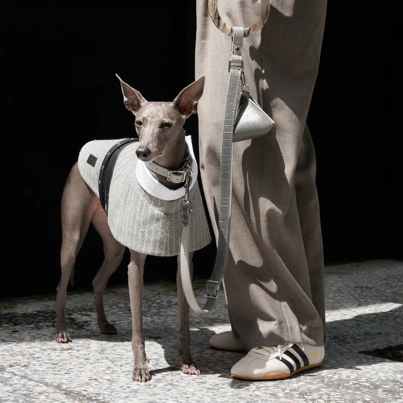 上質なウールツイードに施されたグレーとホワイトのピンストライプは、クラシックなサヴィル・ロウ仕立てを思わせつつ、スタイルを意識する愛犬のためにデザインされています。