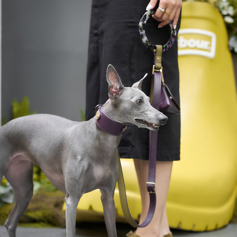 バイオレットのリザード型押しレザーと、スムースなライトグリーンレザーを組み合わせた唯一無二のバイカラーデザインで、お散歩のたびに注目の的に。
