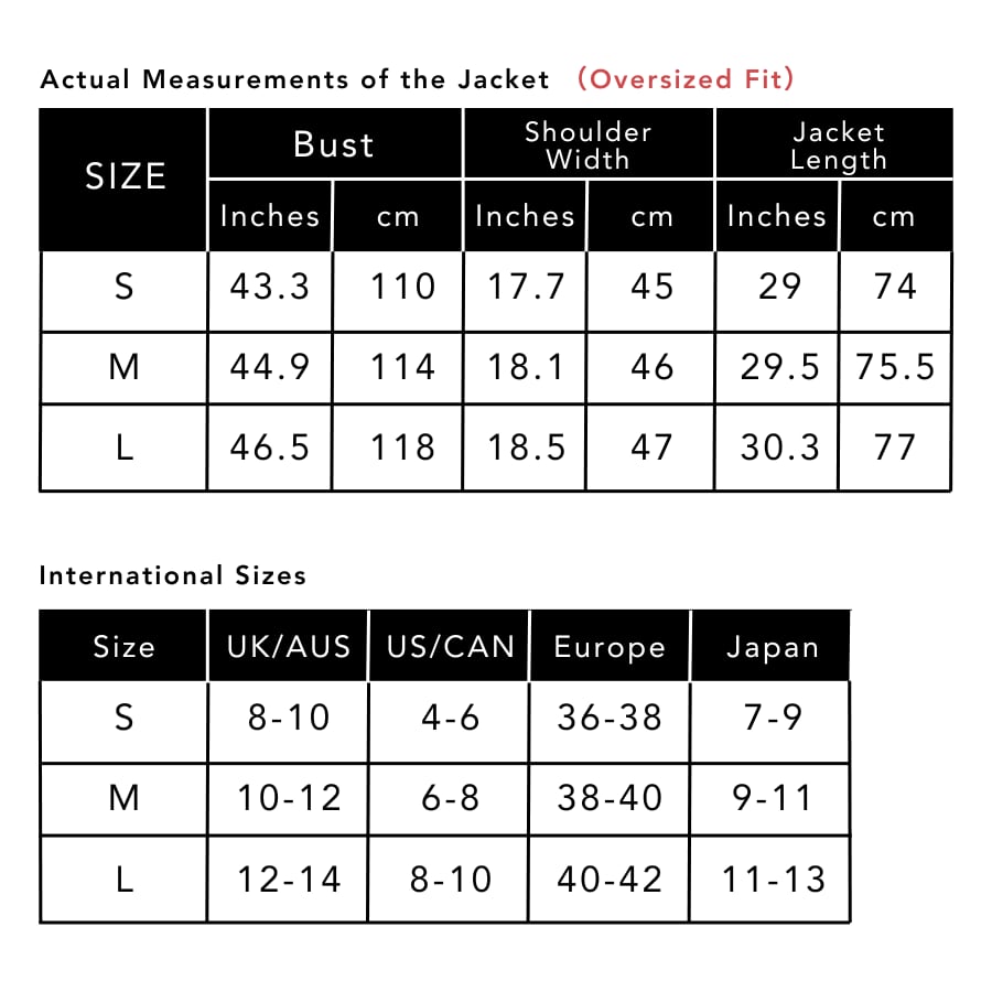 Size / Bust(バスト) / Shoulder Width(肩幅) / Jacket Length(着丈)