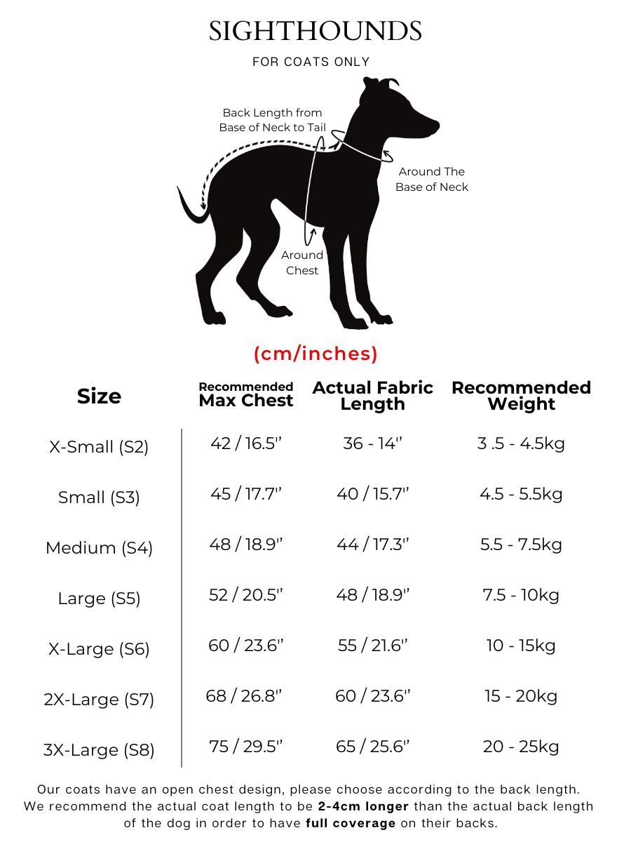 このコートは サイトハウンド専用 で、胸元が開いたデザインです。背丈を基準にサイズをお選びください。
