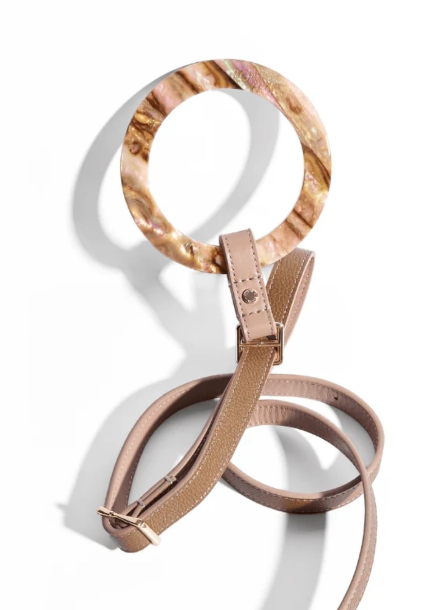 ピンク翡翠のようなアセテートハンドルが洗練されたアクセントを加え、ゴールドのハードウェアが上品さを際立たせます。柔らかなエレガンスを好む愛犬と飼い主にぴったりの特別なリードです。