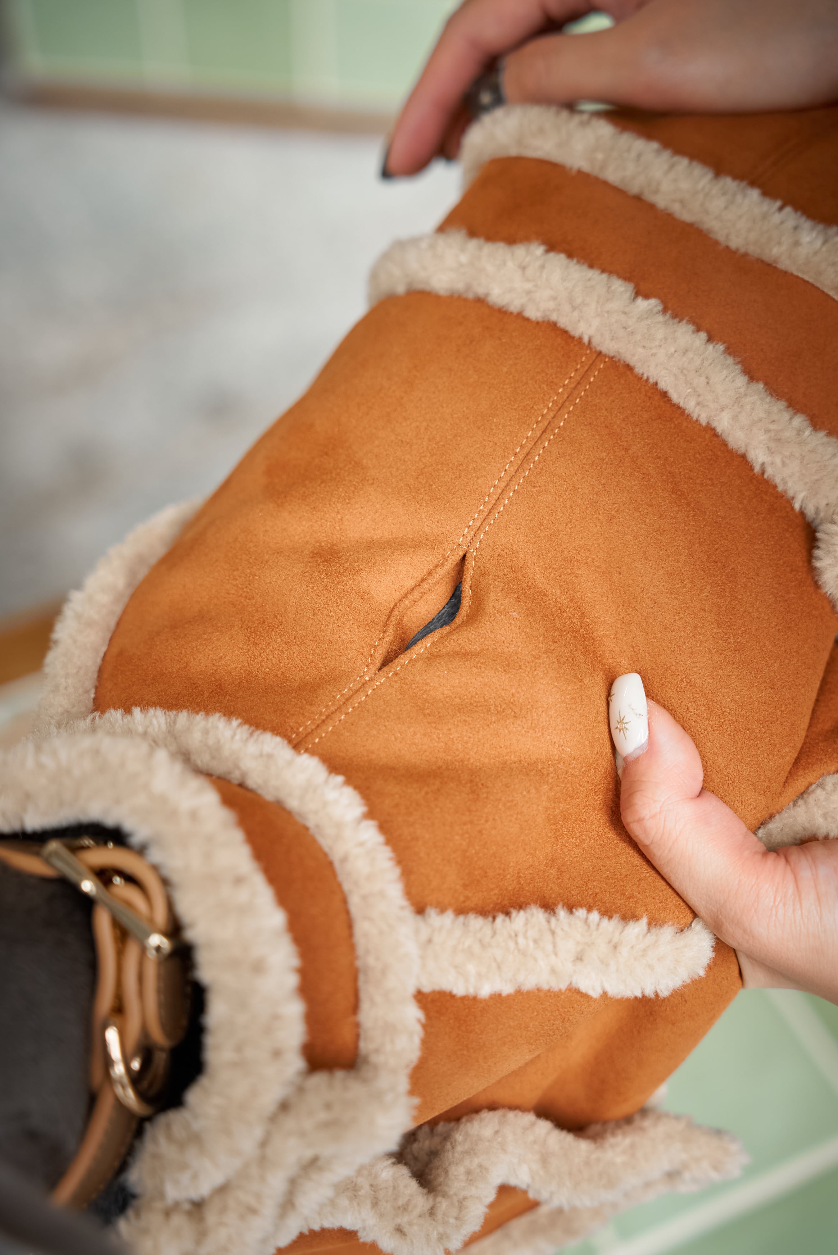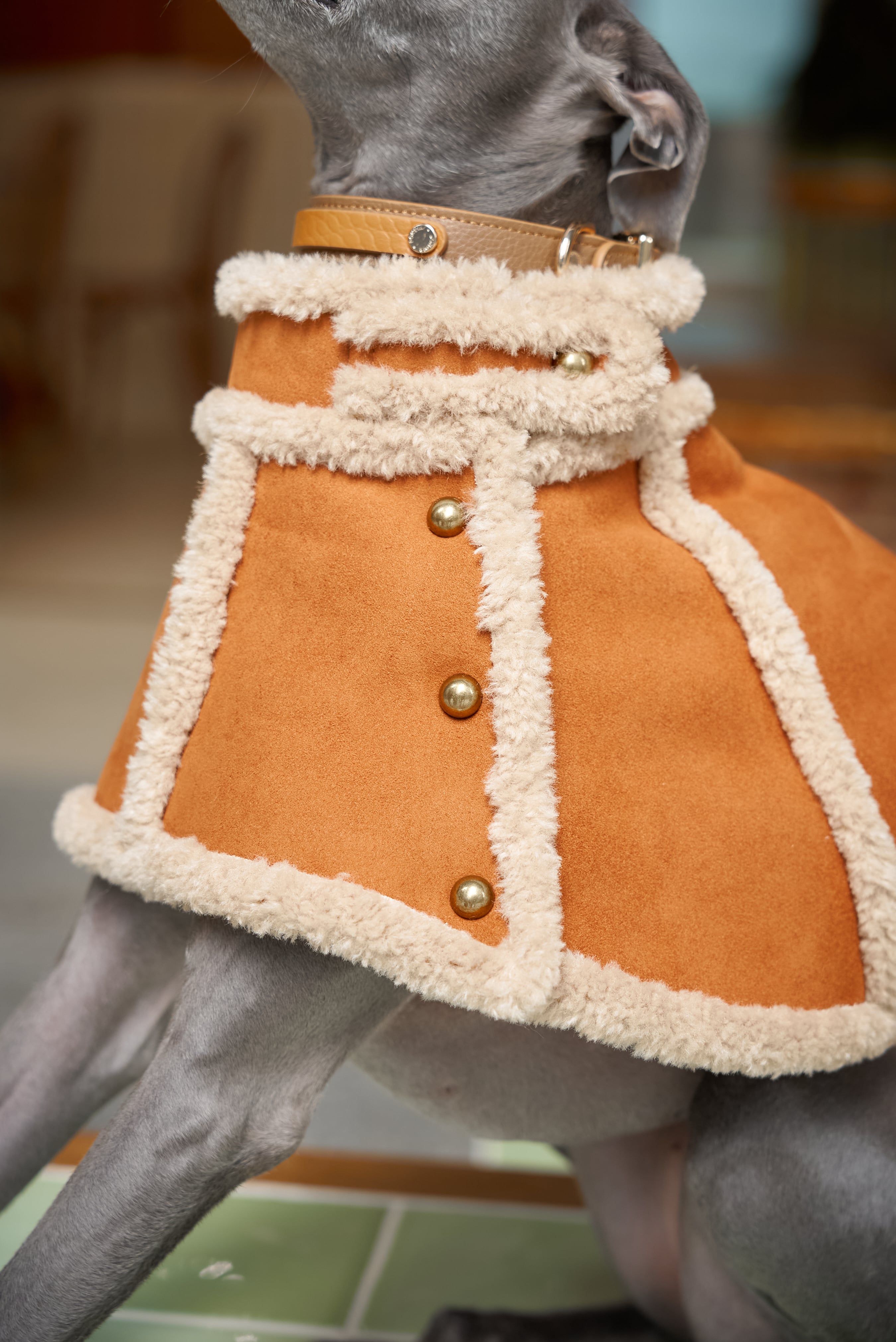 「バルモラル・テディコート」で、愛犬に王室級の温もりを。最高級のブラウンベージュのヴィーガンテディファーで作られたこのコートは、温かさとトレンド感を兼ね備えた一着。暖かさ、スタイル、そして持続可能なラグジュアリーへの揺るぎないこだわりが見事に融合しています。