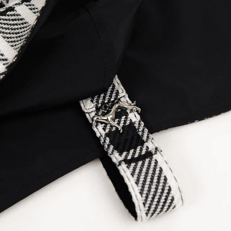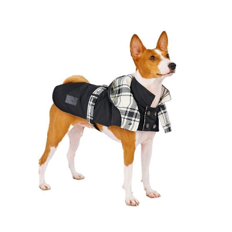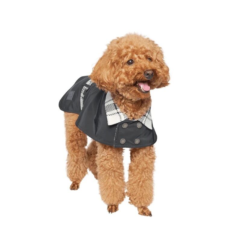 「ロンドン・トレンチコート」は、洗練されたニュートラルカラーとクラシックなチェック柄が魅力。愛犬が景色を楽しみながら探検するのにぴったりの一着です。