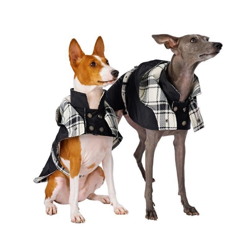 「ロンドン・トレンチコート」は、洗練されたニュートラルカラーとクラシックなチェック柄が魅力。愛犬が景色を楽しみながら探検するのにぴったりの一着です。