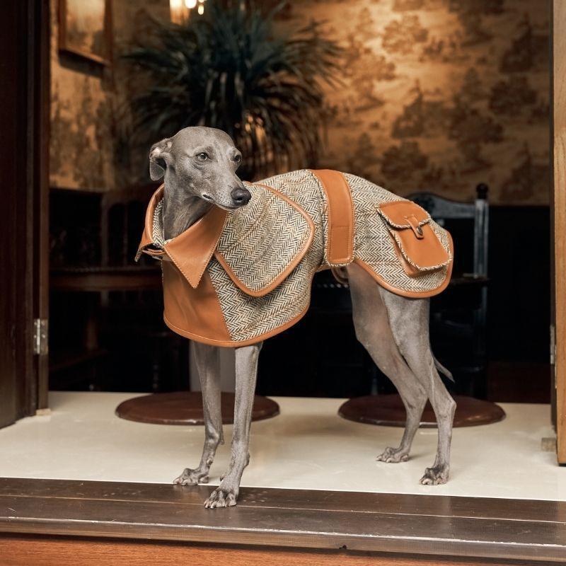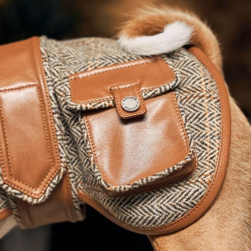 100% ヘリンボーンウールツイードで仕立てられた「VELLURE トレンチコート」は、ラグジュアリーファッションの真髄を体現。落ち着いたアーストーンが愛犬の魅力を一層引き立てます。